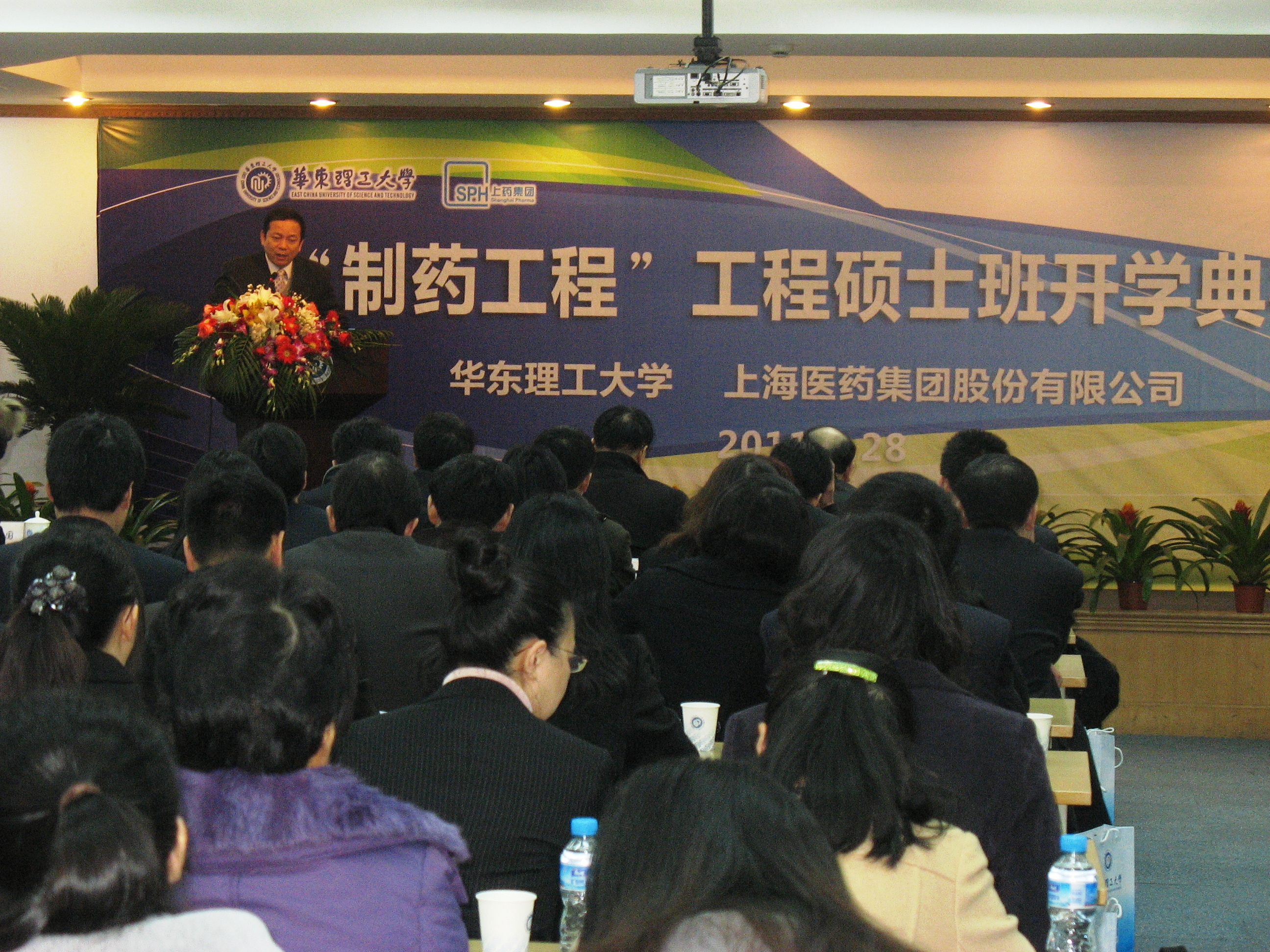 2010级制药工程工程硕士上药班开学典礼在逸夫楼演讲厅举行。国家食品药品监督管理局原副局长任德权,上海医药党委书记、副董事长张家林、上海医药总裁徐国雄、副总裁姜远英,以及杏吧原创
