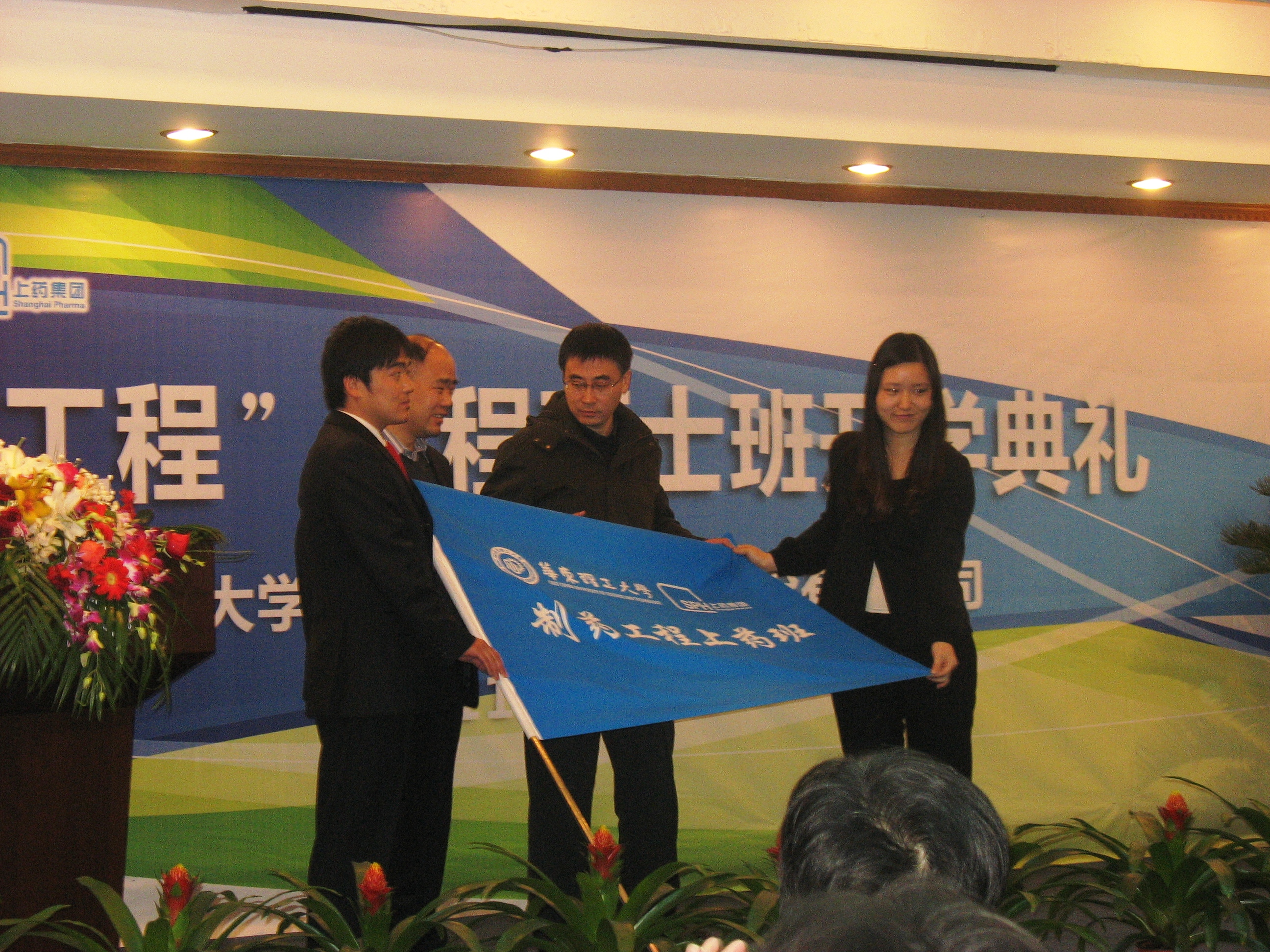 常务副院长徐玉芳教授介绍了上药班的培养方案。按照培养方案的要求,30名学员将在一年内完成理论课程的学习,之后用两年时间结合生产实际开展课题研究,撰写学位论文。学校与上药集团充分沟通协商,共同制定了上药班的课程培养方案,并为每位学员配备学校、企业“双导师”。最后学员代表班长汤文洁做了班级介绍和展示,上海医药副总裁姜远英先生与华理研究生院常务副院长林嘉平教授合授“上药班”班旗。