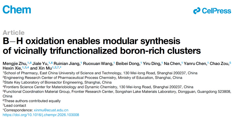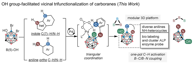 慕欣课题组在国际权威学术期刊《Chem》发表题为“B−H oxidation enables modular synthesis of vicinally trifunctionalized boron-rich clusters”的研究论文。该研究提出了一种“羟基导向”策略,通过锰促进的B−H键选择性氧化和钯催化的环化反应实现了碳硼烷硼顶点的邻位精准三官能化,并可高效引入广泛的复杂药物分子片段与杂环结构,且通过后期修饰可合成一系列含有生物靶向基团的碳硼烷-生物分子偶联物,并成功构建了含碳硼烷结构的碱性磷酸酶(ALP)荧光探针,为硼中子俘获疗法药物和三维生物探针的开发提供了全新平台。